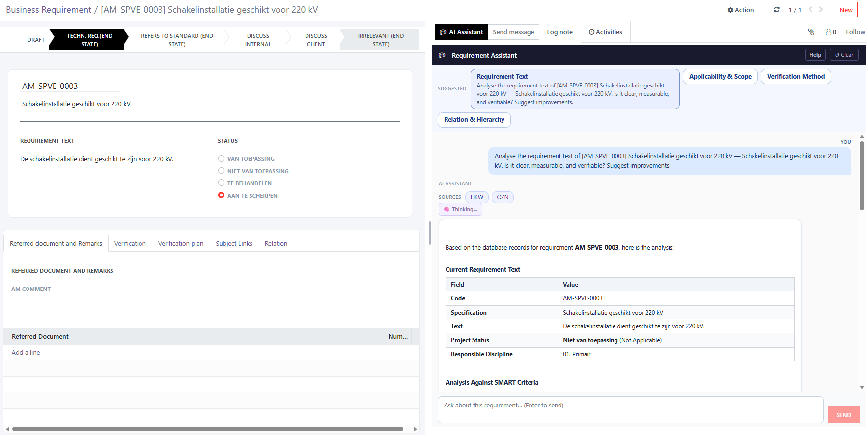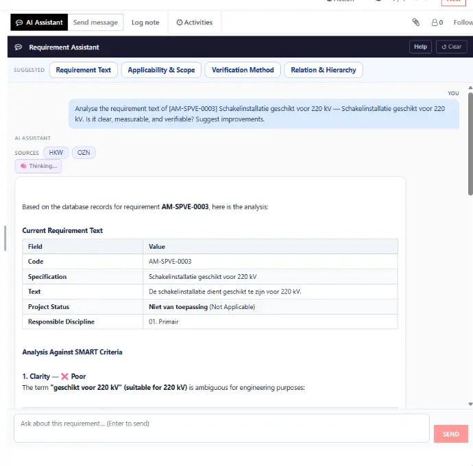 Leveraging archived project databases spanning over a decade of experience across 10 major projects for a single client, we have developed an advanced AI-supported requirements management tool that transforms how engineers analyze and manage their engineering scope.